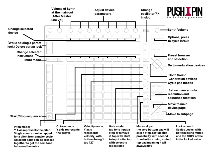 - 1/8t Mute skip: the very bottom pad will skip a step, the rest decide probability with second from bottom being muted; top pad meaning it will always play.